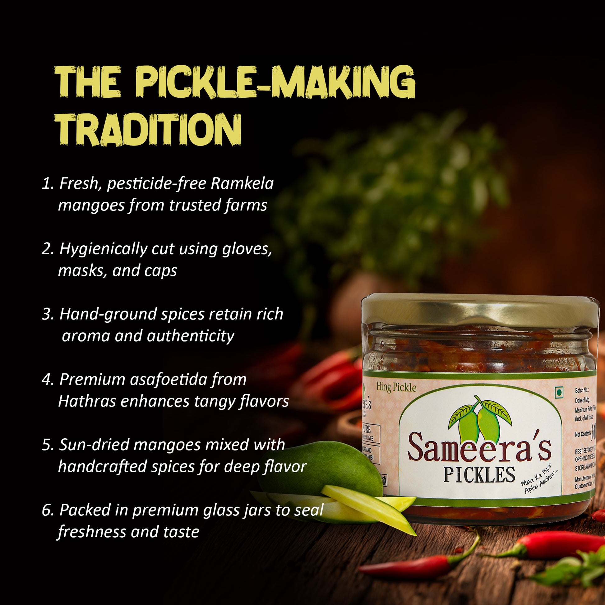 Prepared using pesticide-free mangoes and traditional hand-ground spices for authentic taste and purity.